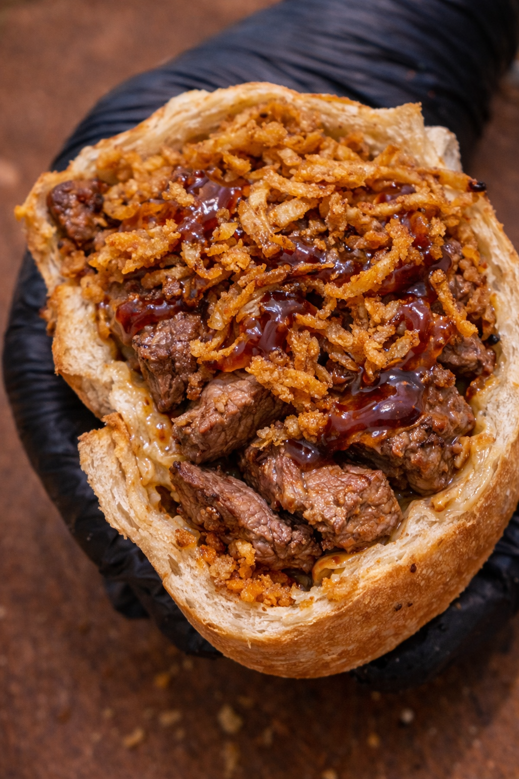 Pão baguete com pasta de alho artesanal, Alcatra Bovina ao molho barbecue, cebola crispy e queijo muçarela gratinado.