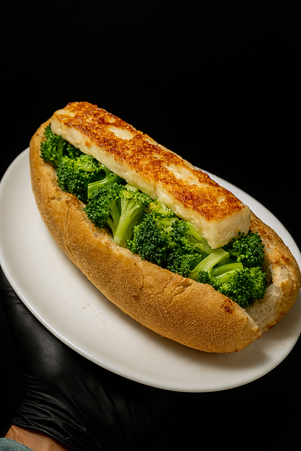 Pão baguete com pasta de alho, brócolis com queijo coalho e queijo muçarela gratinado.